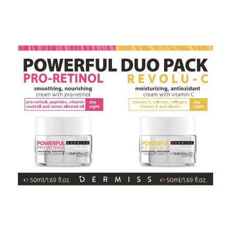 DERMISS POWERFUL DUO - 2 kremai veidui REVOLU-C su vitaminu C ir PRO-RETINOL, su retinoliu, abu tinkantys dienai ir nakčiai, 2x30 ml